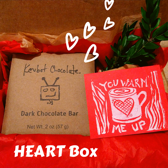 We also have HEART Boxes available for preorder, to ship for Valentine's Day! Four bars, your choice of handprinted card, and a special Kevbot Chocolate recipe card in each box.